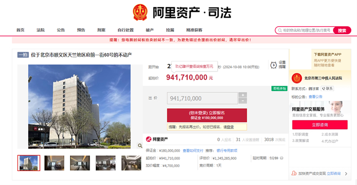 北京市第三中级人民法院将于2024年10月8日10时至2024年10月9日10时止(延时的除外)在阿里资产平台上对位于北京市顺义区天竺地区府前一街60号的不动产进行公开拍卖活动。