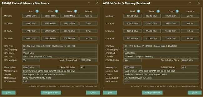 开启XMP以后先来简单跑个分,从AIDA64的内存测试成绩来看,双通道对于内存跑分的提升还是非常显著的,不管读取、写入还是拷贝,双条32GB成绩都对单条16GB实现了翻倍,延迟则基本还是同一水平。
