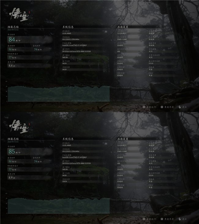 直接进入《黑神话:悟空》的对比测试,从结果来看,双条32GB的平均帧率提升了1 FPS,显存占用则上涨0.3GB,其它数据没有变化。显然,16GB内存已经足够应付《黑神话:悟空》,并且也不挑单双通道。实际通过内存占用率来看,16GB单条占用达到了79%,基本只能算够用水平,后台一旦过多就有爆内存的风险。反观双条32GB占用仅为47%,用起来就从容了不少。