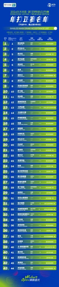 作为本年度全球最后一站WTA1000赛事,本届武网世界排名前44的顶尖球员参加,其中包括7位大满贯女单冠军和4位前先后登顶世界第一的“球后”,本赛季四大满贯的冠亚军得主、巴黎奥运会女单奖牌得主都将齐聚江城,携手为球迷们带来一场场世界级的赛事盛宴。