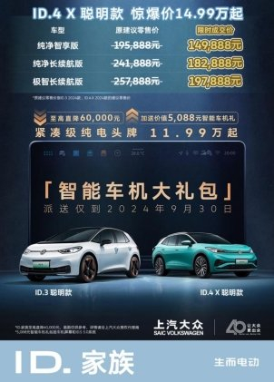 其实,自2021年推出至今,ID.家族达成近30万辆累计销量,ID.4X作为首款车型,目前累计销量已突破10万辆。而本次升级推出的上汽大众纯电动车ID.4X聪明款更是刷新了人们对纯电车的期待,尤其是它智驾功能的提升,不仅仅是为了增配提高竞争力,而是切身考虑用户驾驶的高频场景,真正意义上实现绿色智驾,成为让家庭用户“放心”的14万+品质纯电甄选。目前,上汽大众ID.4X聪明款限时成交价14.99w元起,限时赠送价值5,088元的智能车机大礼包(截至9月30日),包括价值3000+的车机屏幕和价值2000+的ID.S5.0系统,订车即享10,000ID.豆,车主5重必享权益+5款无忧包随心换,以及ID.Care保值包等丰富的赠送权益可享受,更多优惠可以到线下门店去了解下,感兴趣的车友不要错过。
