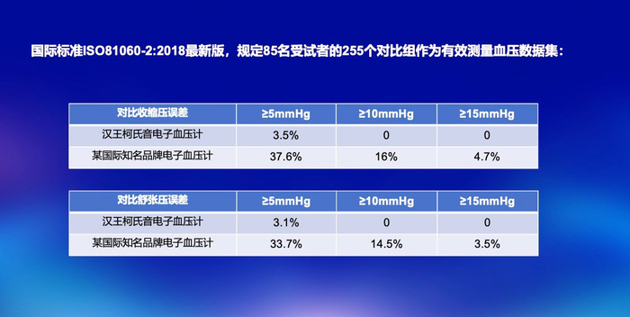 国际权威机构基于国际标准ISO81060-2:2018最新版,以85名受试者的255个对比组作为有效测量血压数据集,分别用汉王柯氏音电子血压计与水银血压计、某国际知名电子血压计进行对比误差测试。测试结果显示某国际知名品牌电子血压计收缩压与舒张压平均误差≥5mmHg分别有37.6%、33.7%,≥10mmHg分别有16%、14.5%,≥15mmHg的分别有7%、3.1%;而汉王柯氏音电子血压计收缩压与舒张压平均误差≥5mmHg的仅为3%左右,≥10mmHg和≥15mmHg均为0,充分印证了其兼备电子血压计的便利性和水银血压计听诊法的准确性。