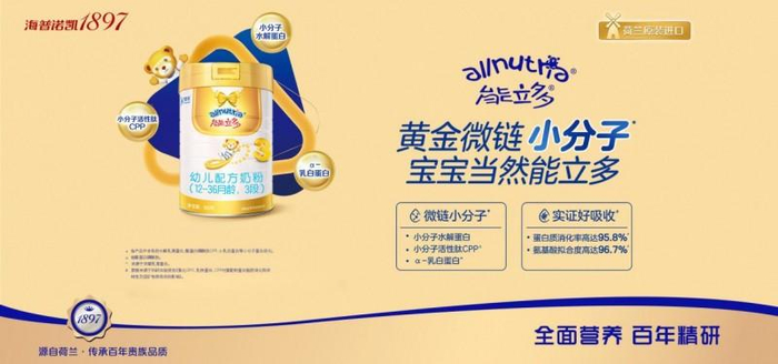 作为澳优旗下的高端进口小分子奶粉品牌,能立多致力于为宝宝提供更贴合天生所需的营养,自成立以来便专注于母源氨基酸拟合度、小分子蛋白、α-乳白蛋白、小分子活性肽CPP等营养研究,为宝宝提供了更易吸收、更全面的营养支持。凭借消化吸收方面的独特优势,能立多深受家长们的喜爱和青睐,在市场上有着良好的口碑。