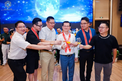 夏炜会长携各商会领导班子一同登台祝酒。来宾们满斟明月,宴秋以星,共同祝愿亲朋平安顺遂,身体康健;商会破浪前行,再绘新篇;祖国山河锦绣,国运昌盛!