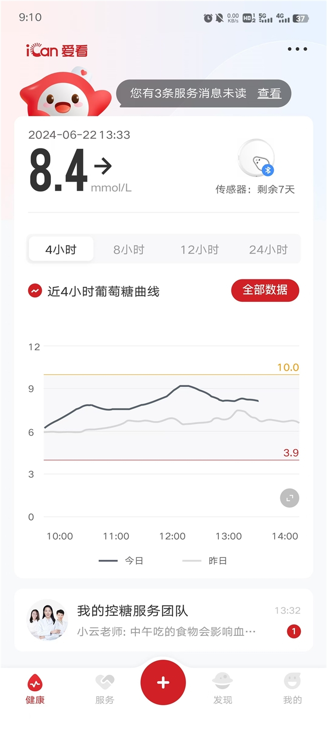 相比传统指尖血糖仪只能反映某个时间节 点的血糖数值,三诺爱看能准确反映全天候24小时的血糖变化,并且持续监测15天,每3分钟生成一次血糖值,一次佩戴等于测糖7200次,手机上可随时查看,去医院复诊时可以拿着手机让医生查看自己期的血糖数据,非常直观专业。并且三诺爱看采用了IP28级防水设计,时运动出汗、洗澡、游泳也丝毫不影响使用。