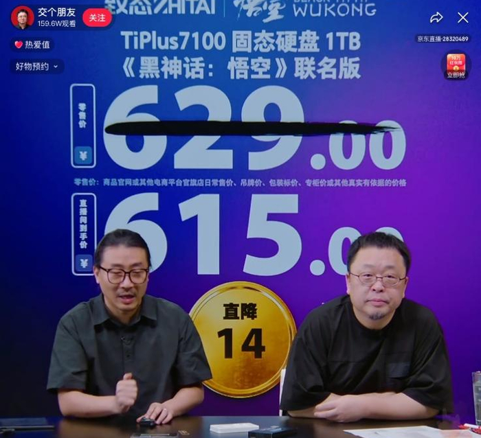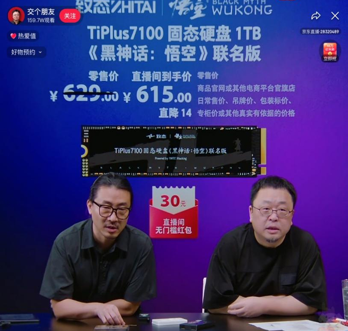 9月19日晚,罗永浩与搭档朱萧木现身京东919农特节“大圣之旅”直播间,力荐致态TiPlus7100固态硬盘《黑神话:悟空》联名版。老罗盛赞其稳如磐石,该产品成为当日直播间热卖产品。