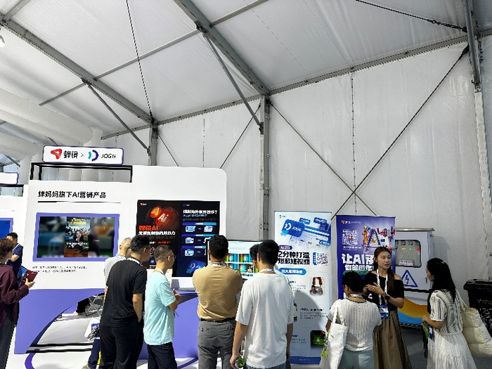 在大会的前沿应用馆中汇聚了诸多让人耳目一新的AI落地应用,其中蝉妈妈旗下的蝉镜与JoggAI以“AI+电商”为核心打造的数字人营销产品,引得在场大部分AI从业者关注,展位前人山人海,交流不断。