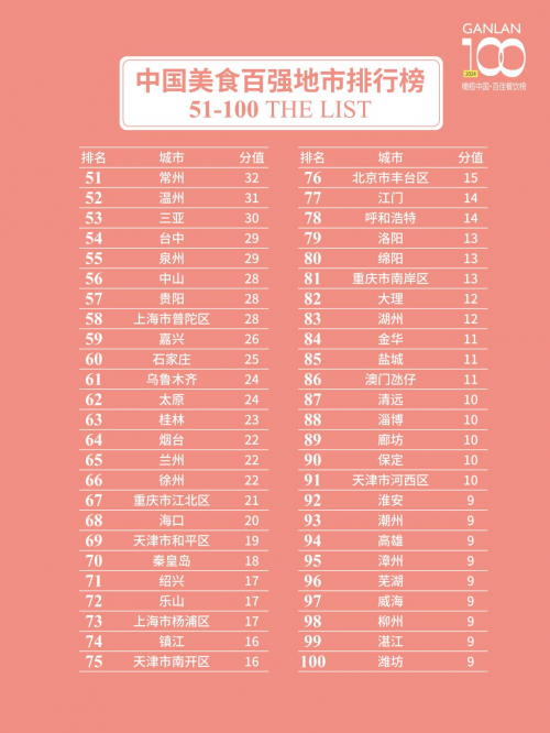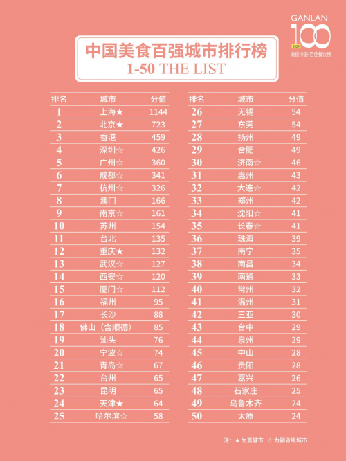 中国美食百强城市排行榜坚持客观、专业的原则,结合米其林指南、亚洲50佳餐厅、黑珍珠餐厅指南、橄榄中国·餐厅大奖、金梧桐餐厅指南、携程美食林、大众点评必吃榜等一众知名餐饮奖项,按照获奖餐厅数量,计算对应奖项权重,最终核算中国各大城市评分,取前一百名,评选出“美食百强城市排行榜”,以及据此细分之后衍生的”美食百强地市排行榜“和“直辖市与副省级城市美食实力排行榜”。