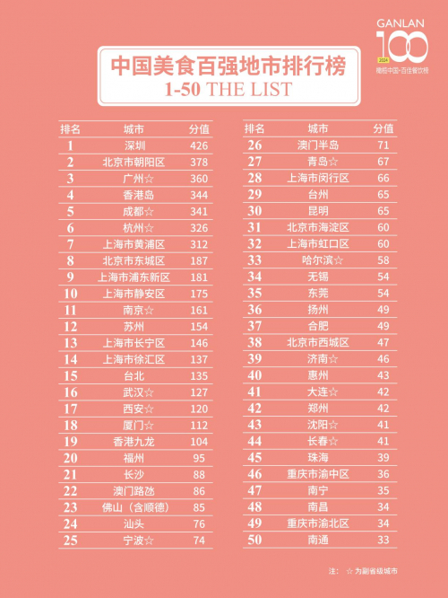 * 作为副省级城市的深圳以426分高居榜首,紧随其后的是北京朝阳区(378分)和广州市(360分)。朝阳区占全市分值过半,超过东城、海淀、西城总和,其作为北京美食中心区的地位可见一斑。
