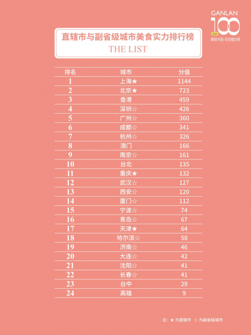 为了更好地进行城市对比,我们还拆分出了“直辖市与副省级城市美食实力排行榜”。