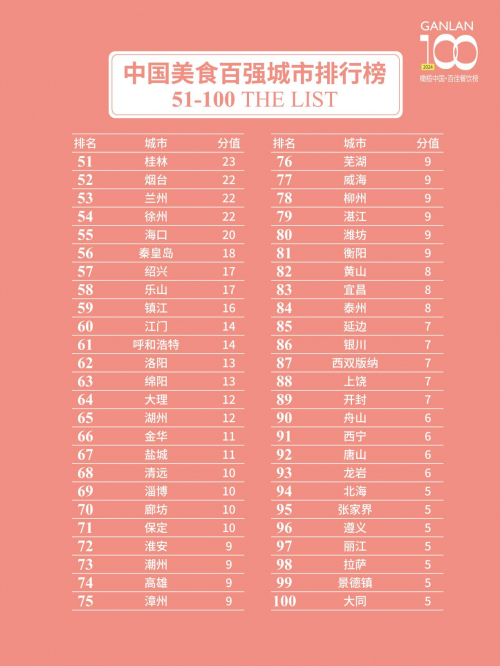 * 排名位于51-100名的城市,与近几年盛行的“小众城市游”有非常大的重合度,诸如淄博、延边、威海、金华等城市成为近几年的反向游目的地,也是潜在的餐饮蓝海。