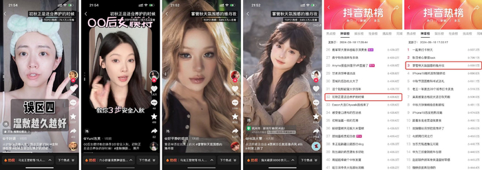为了提升活动热度,活动还策划了换季方向的两大热点话题,吸引了@千叶遥、@九月Rue、@Yuni泡芙、@好平静的姐姐、@肉松小淳(开学版)等超百位达人和商家参与,广泛覆盖兴趣人群,实现活动破圈。在大量达人趋势内容共创助推下,话题#初秋正是适合养护的时候、#掌管秋天氛围感的雅丹妆 最高登上抖音种草榜TOP3,大量用户围观学习,话题热度不断攀升,1.5万+商品配合SEO优化,搭配“初秋补水修护”和“雅丹妆造好物”等趋势关键词的搜索引导,进一步刺激消费欲望,促进商城转化。
