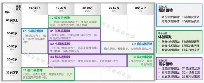 结合用户画像及换车动机,我们将换购用户划分为经济驱动、体验驱动、需求驱动三大群体。
