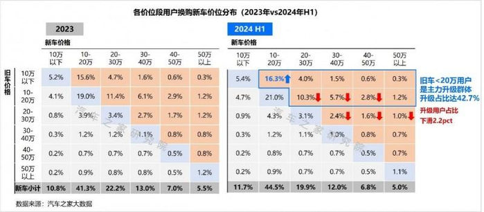 2024上半年换购用户新车均价提升约4万元,价格升级比例接近50%,价格升级仍然是换购用户的主流方向。但旧车价格在10-20万的主力升级人群,出现了升级乏力,仅有不足一半的车主继续选择升级,相比去年降低了1.6个百分点。这一趋势也延续到了旧车原价在20-30万的人群,升级的比例减少0.6个百分点,带动换购中高价位段占比缩小。