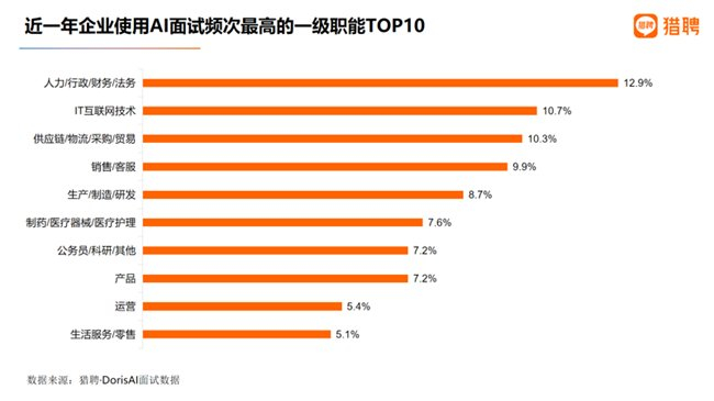 近一年来,企业使用猎聘·Doris进行AI面试的数据显示,人力/行政/财务/法务职能应用AI面试最为广泛,占比12.9%;IT互联网技术、供应链/物流/采购/贸易紧随其后,位居第二、第三,占比均超过10%;销售/客服、生产/制造/研发、制药/医疗器械/医疗护理、公务员/科研/其他、产品、运营、生活服务/零售位居第四至第十。