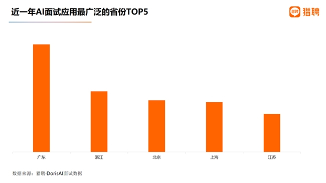 从近一年使用猎聘·Doris进行AI面试的企业所在省份分布看,广东、浙江、北京、上海、江苏位居前五。