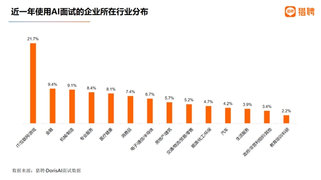 IT/互联网/游戏行业人才竞争激烈,同时由于本身为技术前沿行业,技术敏感性强,对新技术的接受和应用速度较快,加之当前企业降本增效的整体趋势,因此使用AI面试的企业较多。