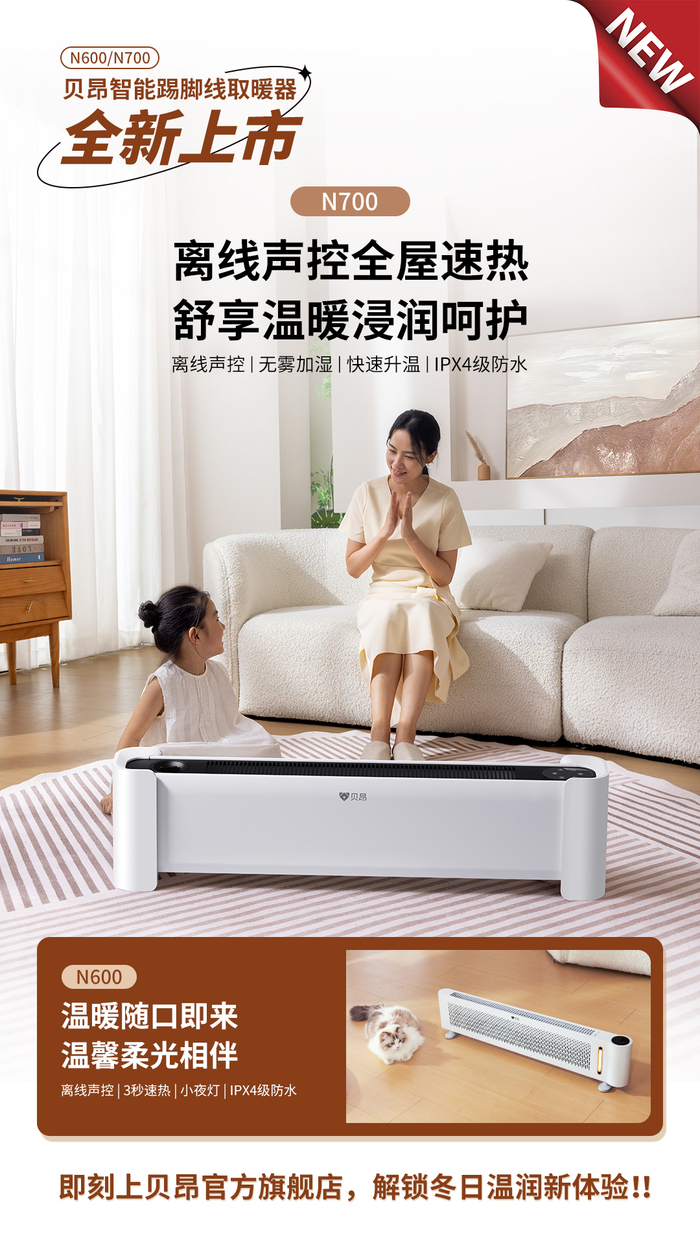 贝昂智能踢脚线取暖器全新上市,温暖随口即来