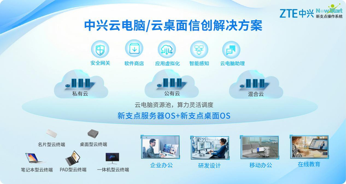 作为云电脑领域的主流厂商,中兴通讯还结合自身数字化转型经验已打造新一代云电脑/云桌面的信创整体解决方案,结合中兴云电脑+中兴新支点操作系统,为用户提供极尽安全、极致体验、算网一体、自主创新的电脑上云办公体验。支持全栈信创和过渡方案共存,解决由于软件适配、业务改造不完全导致信创PC无法使用问题,盘活信创PC资产。采用高性能信创服务器替换信创PC主机,解决由于信创PC芯片性能不足导致的体验不佳问题,提升办公体验。实现模板统一部署、更新与维护,软硬件资源统一管理,简化运维管理,减少IT人员工作量。移除终端数据,加强终端管控,有效防止USB、串口拷贝感染病毒,确保内网数据信息安全。