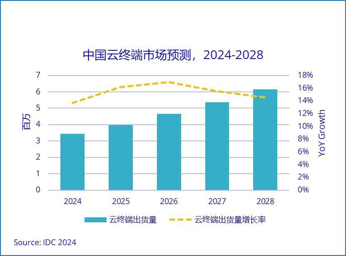 报告显示,2024上半年中国云终端市场总体出货量达到166.3万台,同比增长22.4%,销售额29亿元人民币,同比增长24.9%,均超预期。公有云部署拉动消费类云终端增长以及新定义下云终端市场硬件设备拓展到平板电脑和手机,导致了这一市场的积极表现。IDC预计,至2028年中国云终端市场规模有望超过615万台,五年复合增长率将达到15.8%。