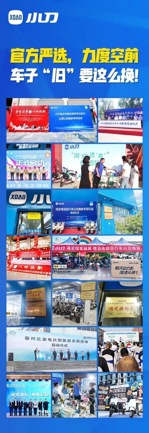 面对这一政策背景,小刀电动车迅速响应,在全国范围内积极响应并参与以旧换新活动。此次活动不仅为消费者提供了多重补贴的优惠政策,还通过一系列便民服务,让更多人享受到了电动车出行的便利与实惠。