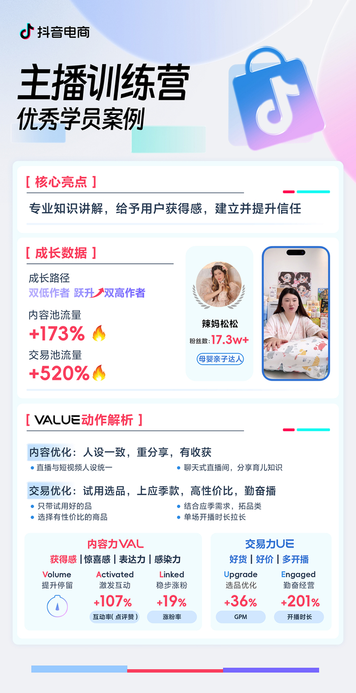 在“潜力作者主播训练营”学习之后,松松发现,要打破账号成长的僵局,建立信任和展现专业度是关键。于是,她基于自己早产妈妈的身份,不断优化选品和直播内容,给粉丝们更多获得感和陪伴感。
