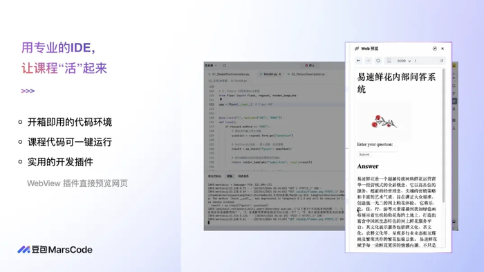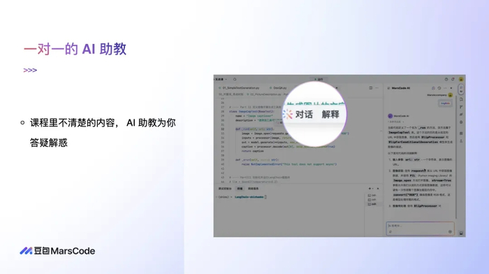 针对学习新语言或框架时面临的繁琐环境搭建与低效学习问题,豆包MarsCode 推出了 AI 练中学产品。该产品通过专业的 IDE 激活课程,为开发者提供开箱即用的代码环境,极大缩短学习准备时间。同时,AI 助教的无缝嵌入,让开发者在学习过程中遇到问题时能够即时获得解答,无需跳出课程进行搜索比对。