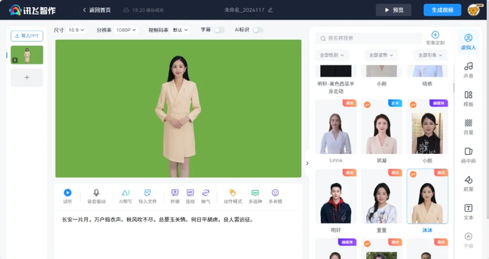 在很多教培课件制作场景下,很多老师会选择使用炫酷的PPT动态转场加虚拟人授课提升整体课堂趣味性。机构可以利用电脑自带的录屏软件将已有的PPT录成动态的视频,接着在讯飞智作官网,在导航栏点击AI虚拟人依次选择虚拟人形象、复制准备好的文案讲稿内容并选择匹配的声音。
