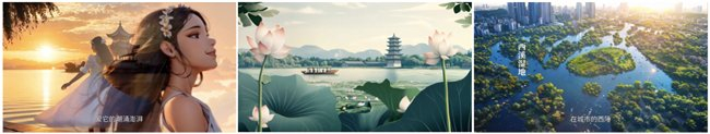 这部获奖作品主线由第一人称的白素贞带领我们展现了一条从“良渚”到“宋代”,再到“现代”,最终到达“未来”的穿越故事线。镜头视角从“海水”到“西湖”,再到“钱塘江”,最终到达“想象中的未来水中世界”,作品以杭州的“水”作为副线,通过历史上一次次水的变幻来隐喻时代的变幻,同时以“水”作为每次镜头穿越的转场。参赛团队通过使用AI艺术字、瞬息全宇宙、首尾帧、转绘+AE建模特效等技术能力增添了画面的创意表现;尤其是从古代转场到现代的画面,利用AI瞬息全宇宙呈现穿梭的过程(一镜到底地从古代的西湖一路划船变成现代的西湖),进而全景化地展示亚运场馆、龙坞茶园、云栖竹径等地标建筑和特色。整部作品节奏连贯、立意新颖,从历史、文旅、科技等多个方面描绘了不同时期的杭州印象与想象,同时也不失细节上的创新亮点。