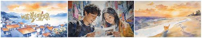 《猫影鹭踪》是这次赛事中以“动物”为主角的代表作品,通过“猫咪带领我们漫步的现代文化线”和“白鹭带领我们畅游的历史文化线”相互交叉来展示厦门的文化底蕴和现代魅力。视频开头一只慵懒的猫咪先行出场,展现其在厦门的街头巷尾悠闲漫步的场景;随着画面逐渐展开,出现白鹭的身影;结尾画面猫咪与白鹭相遇的瞬间,它们在同一个画面中并肩而行,象征着厦门这座城市的历史与现代之间的文化交融。结合厦门独特的文艺气息,共创团队在这部作品中尝试使用水彩的画风来展现宛如画作的风景,使用图生图风格转绘、图生视频等技术手段来把控风格一致性、特殊构图;对于AI无法打磨的细节工作,共创团队使用PS重建画面沟通,甚至还实地去录制了白鹭的特殊叫声。