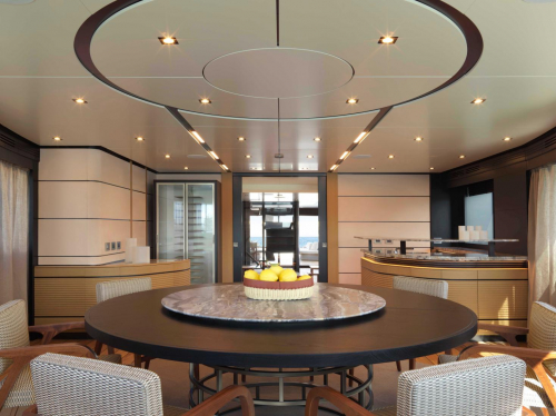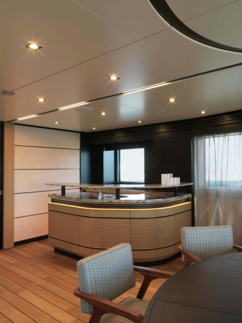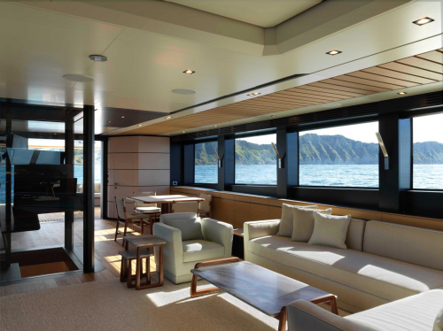 上层甲板的户外区域采用了聚丙烯和Trevira®等科技面料,确保耐用性和防火性,可承受阳光、水和盐份的侵蚀。沙龙区沙发采用淡褐色Dehors Natté三维结构材料制成,辅以Dehors Plain和Stripe材料制成的白色和本色软垫。