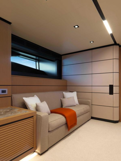 主甲板起居空间与餐区配色方案从自然色调中汲取灵感,优雅的水绿色令其愈加丰盈,而客舱内则在中性色调基础上,采用了燃橙、灰褐和铁锈等更温暖的色系。
