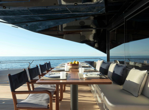 回到主甲板船艉,这里的设计延续采用自然色调与户外面料。这里的The Delight Chairs折叠导演椅采用Dehors Antibes面料装饰,拥有柔软的丝质双色几何图案。宽敞的户外座位区覆盖着Dehors Bouclé白色面料,搭配Dehors Malibu白色与本色靠垫,奢华的席纹编织进一步提升此处格调。