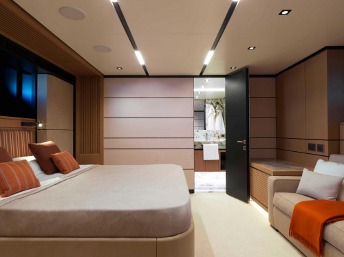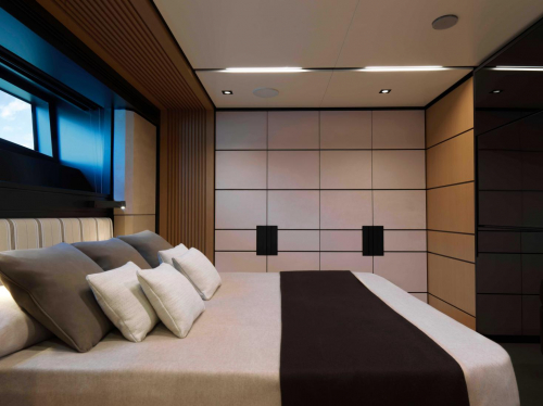 Vallicelli Design专为亚太市场打造的室内设计,其布局特点凸显在“娱乐主甲板”,核心便包括宏伟的船艏待客空间,内设一张大圆餐桌和配备酒柜的吧台。住宿方面,除了下层甲板带横向大床的船艏船东套房外,还有两间超赞的贵宾舱。
