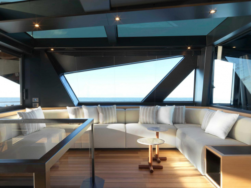 该艇的中心焦点自然是那4.7米高的玻璃船艏,它如战斧般插入海中,劈波斩浪。船艏内部空间拥有震撼的270度全景视野,且因远离发动机舱而静谧如斯。