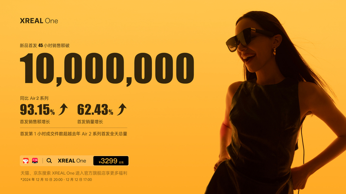 XREAL One一经推出便展现了亮眼的市场表现:首发45小时内销售额突破1000万元,相较Air2系列首发销售额增长93.15%,销量增长62.43%。值得一提的是,其首发1小时成交件数已超越去年Air2系列首发全天总量,显示出消费者对XREAL One的高度期待与认可。