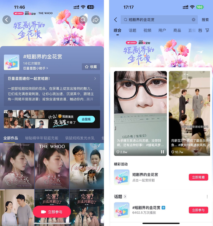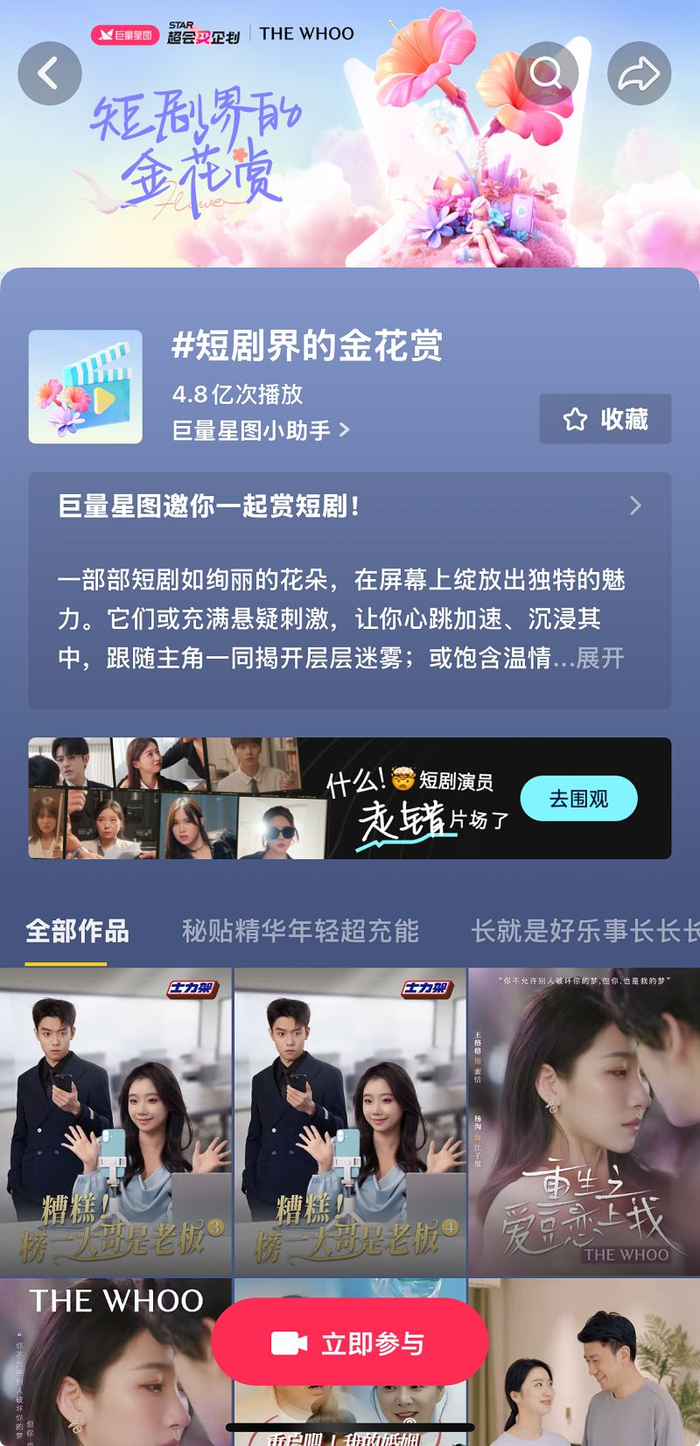 巨量星图此次联合头部短剧达人发起的「短剧界的金花赏」活动,不仅为品牌带来“面子”,助力品牌收获高额曝光和人群破圈,更为品牌带来“里子”,将短剧提供给用户的短时爽点沉淀为长效的品牌心智,让短剧营销不再是看起来的“热闹”。
