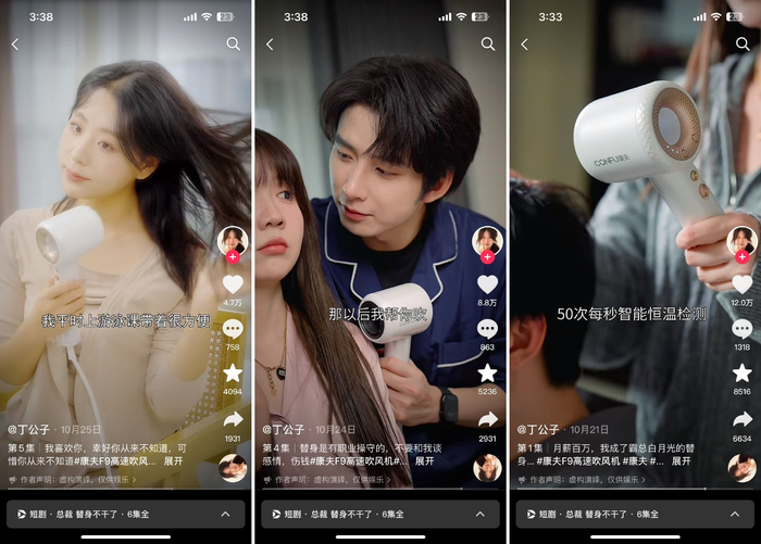 康夫梦幻联动@丁公子 实力上演霸道总裁题材定制短剧《总裁替身不干了》,将康夫F9高速吹风机巧妙融入进剧情中,最终总曝光获得超6600万播放量,新增5A人群超1400万,新增A3人群超310万, 创造了日均搜索UV提升700%的成绩!