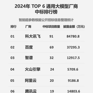 其中科大讯飞以91个中标项目和84780.8 万元的披露中标金额,成为 2024 年度当仁不让的标王;百度排名第二,中标项目69 个,披露的中标金额为37285.3 万元;智谱位列第三,中标项目32 个,披露的中标金额12917.5 万元;火山引擎排名第四,中标24个项目,披露的中标金额为5709.6万元;阿里云则以20个中标项目和9186.8万元的披露中标金额位列第五。