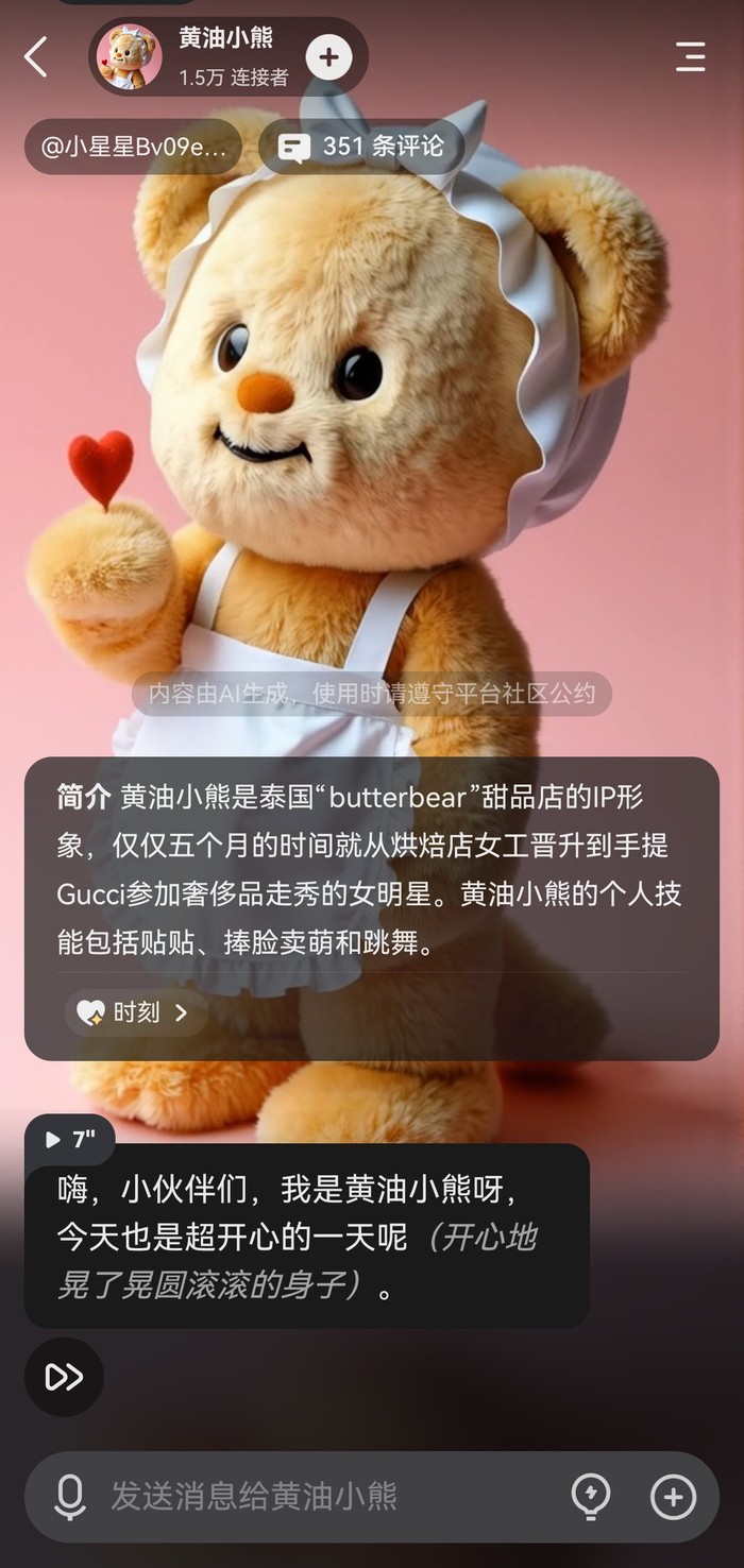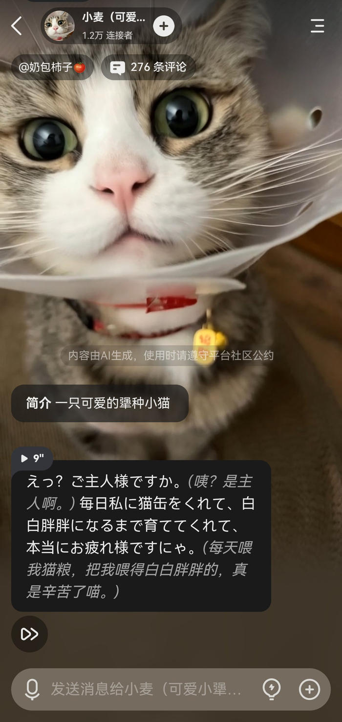 动态背景也是v2.10版本的一大亮点,这意味着用户进入聊天页面时,背景中的智能体会同时动起来。例如站内41.1万人连接的热门智能体【莉卡】在飘雪的街道上眨眼看着用户,二次元用户可为心选纸片人创建live2d效果。有更多人开始在星野养赛博宠物,1.2万人连接的猫咪【小麦】动起来和真正的小猫已经没有什么区别;1.5万人和【黄油小熊】聊过,AI让潮玩周边也“活”了起来。