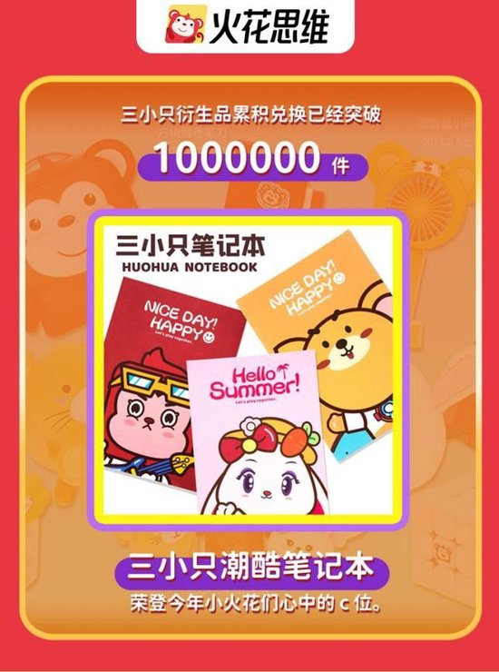 火花思维衍生品也颇受欢迎,累积兑换突破百万件,其中三小只潮酷笔记本兑换量最高。旗下衍生品涵盖了文具、益智玩具、公仔、家居生活、户外用品和饰品等多种品类。