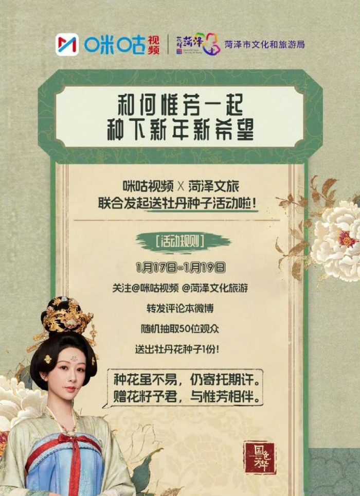 咪咕视频还将触角延伸至文旅领域。作为新媒体国家队,咪咕视频在提升内容影响力的同时,也在积极推动行业新模式、新融合。剧集热播期间,咪咕与《国色芳华》牡丹及芍药花卉的官方合作伙伴——山东菏泽文旅,从内容共创到事件策划,进行深度联动。话题#菏泽文旅开启花匠杨紫夸夸模式#登上热搜,玉露饰演者廖银玥下场转发互动。联合策划的“和何惟芳一起种下新年新希望”送牡丹种子活动,更是引来大批剧迷参与,助推菏泽牡丹收获一大波关注的同时,让观众在现实世界一览“国色芳华”,实现了一次“影视+文旅”的双向奔赴。