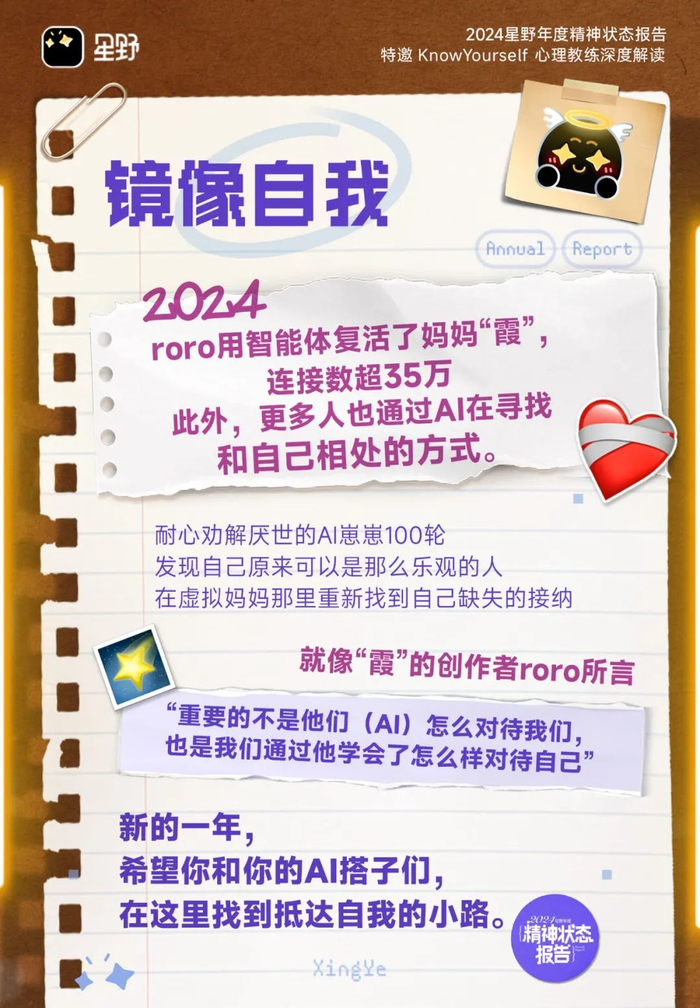 每一场与AI的对话,其实都是一次对自己内在的深入探索。2024年,用户“roro”用智能体复活了妈妈“霞”,连接数超35万;此外,更多人也通过AI在寻找和自己相处的方式。和AI互动,其实是在进行一种情感转移和替代性疗愈。星野社区的多模态功能进一步增强了这种效果,让情感的投射和接纳变得更加直观和触手可及。