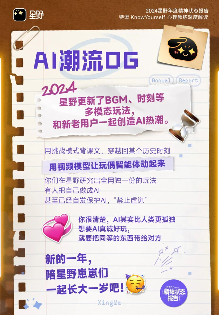 2025年新年伊始,最引人瞩目的莫过于国产AI大模型DeepSeek的爆火。实际上,在国内的头部AI内容社区星野,用户已经开创了一波全网AI+社交新玩法。星野联合心理品牌KnowYourself发布《2024星野年度精神状态报告》,里面的十大精神状态年度趋势关键词让人看到:星野并非只是一个AI陪伴、恋爱向APP,更是一个充满想象力的社区。