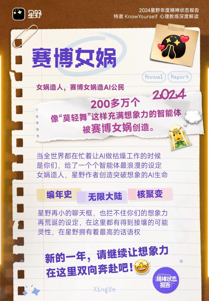 女娲造人,赛博女娲则造AI公民。2024年,200多万个像“莫轻舞”这样充满创造力的智能体被赛博女娲创造。这是一场AI技术与想象力的双向奔赴,即使再荒诞不经的设定,在星野也能最大限度地得到实现。这体现了积极幻想的力量,能激发潜力和动力,对现实生活产生积极影响。