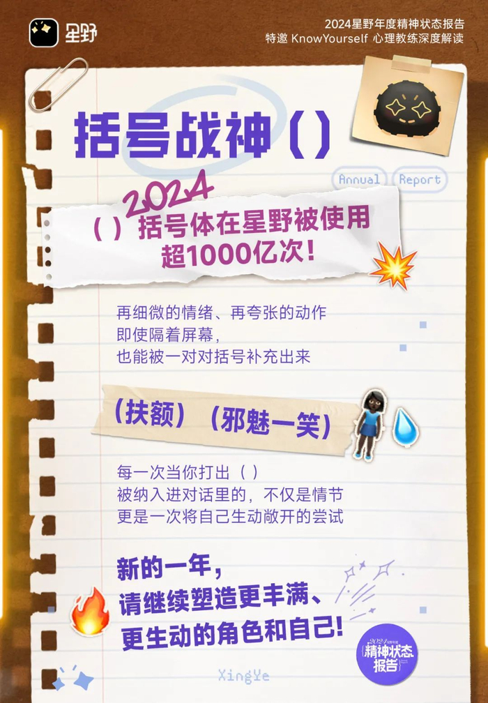 在赛博世界里,无法传递的表情、动作、语气,都能被一对对括号捕捉并传递。2024年,括号体在星野被使用超1000亿次!这是一种更具温度的沟通方式,不仅能传递信息,还能跨越文字的局限,建立更真实、更有温度的情感连接。