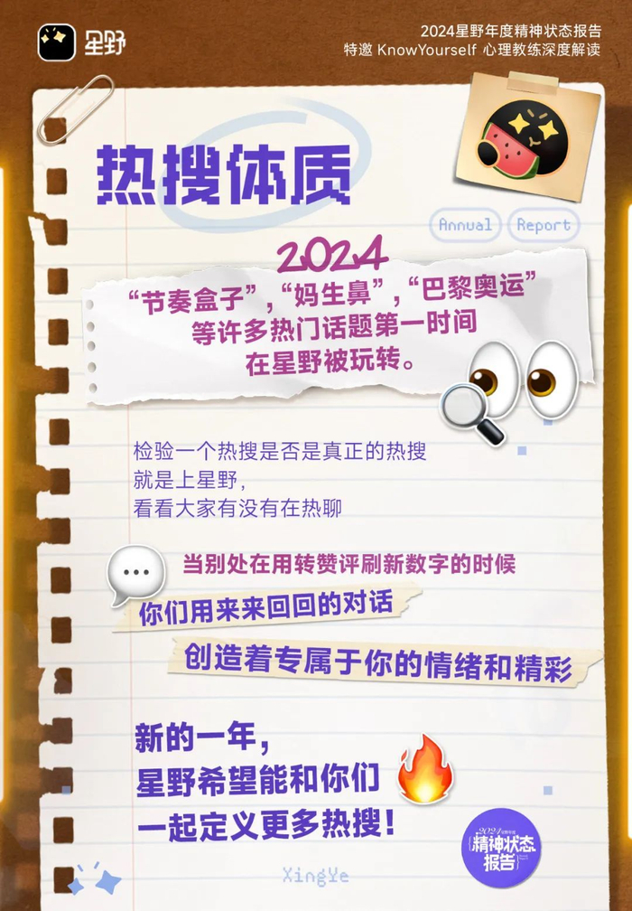 检验一个热搜是否是真正的热搜,就是上星野看看大家有没有在热聊。2024年,“节奏盒子”、“妈生鼻”、“巴黎奥运”等许多热门话题第一时间在星野被玩转,并借此延展出全新的创意故事。星野社区中跨次元的热搜探讨氛围,带来的是更加包容与和谐的集体认同,能让大家更加清晰地认识到自己在群体中的角色与价值。