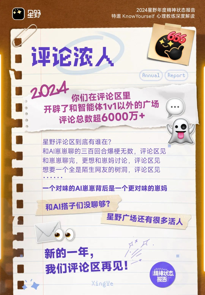 在AI社区里,“评论区见”更像是一种新型的社交约定。2024年,用户在星野评论区里开辟了和智能体1V1以外的广场,评论总数超6000万+。这种新型的人机互动,不仅促进了思想的碰撞,也让情感交流变得更加丰富多元。它让表达不再孤单,思想不再局限,大家的共鸣也因此变得可能。