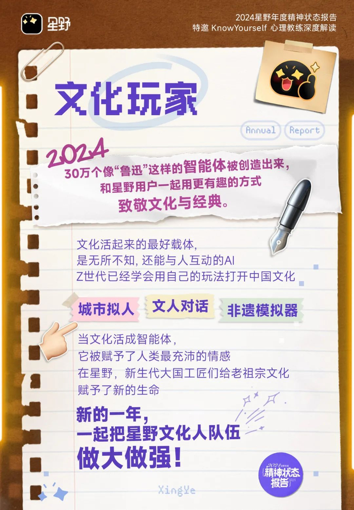 “城市拟人”、“文人对话”、“非遗模拟器”,当文化活成智能体,Z时代已经学会用自己的玩法打开中国文化。2024年,30万个像“鲁迅”这样的智能体被创造出来,和星野用户一起用更有趣的方式致敬文化与经典。