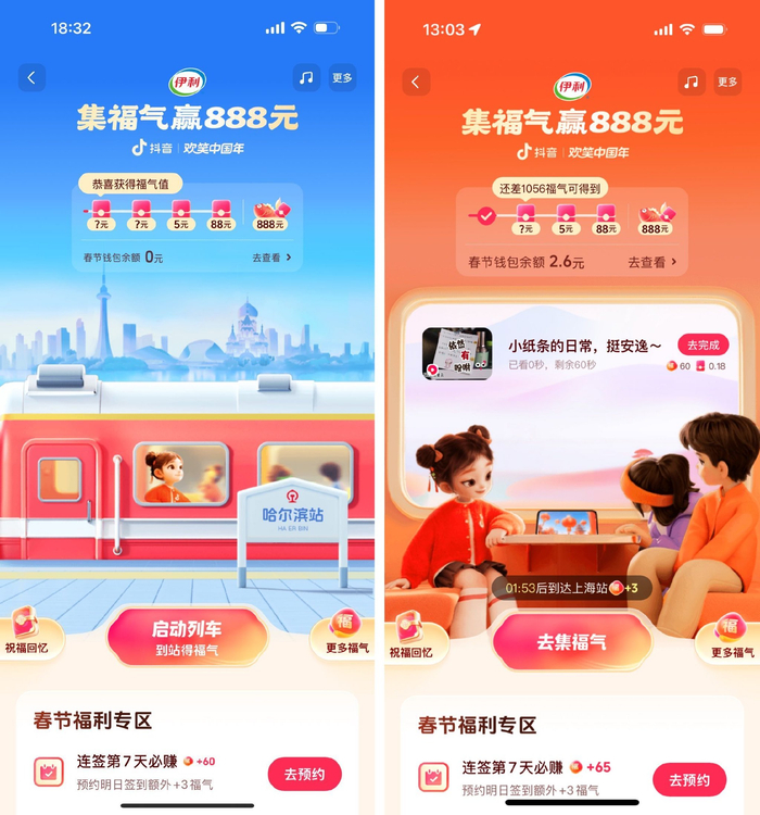 集福气是其中的一项主活动。新年伊始,讨个好彩头是普罗大众的共同心愿。集福气活动敏锐捕捉到这一需求,结合春节前高热的返乡场景,在线上打造专属“福气列车”,以“把福气带回家”的概念邀请用户互动参与、汇聚美好祝愿,收获广泛好评。随着“列车”到达不同站点,用户也解锁了不同的福气值和多样礼物奖励,给一年的鸿运满满开了个好头。